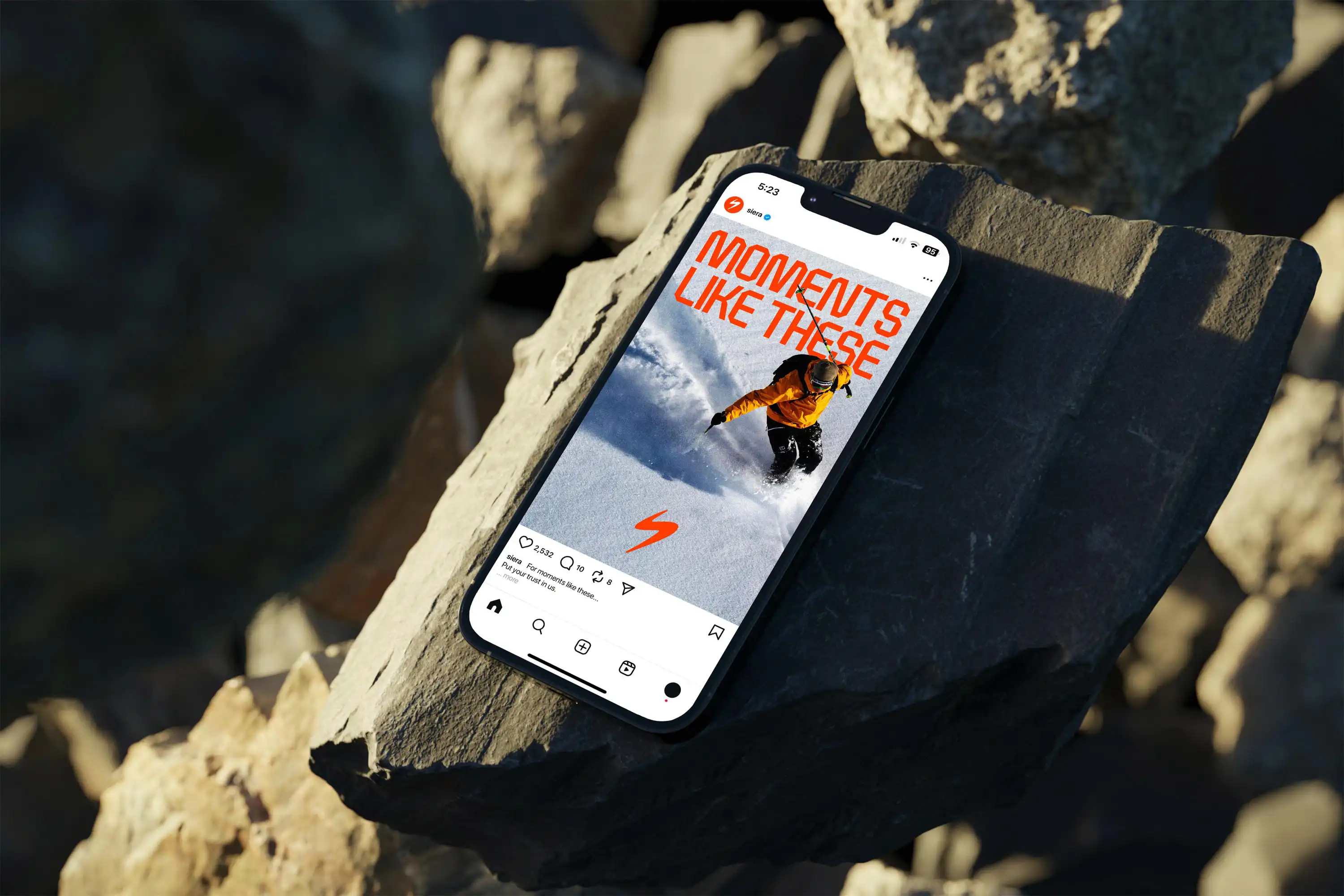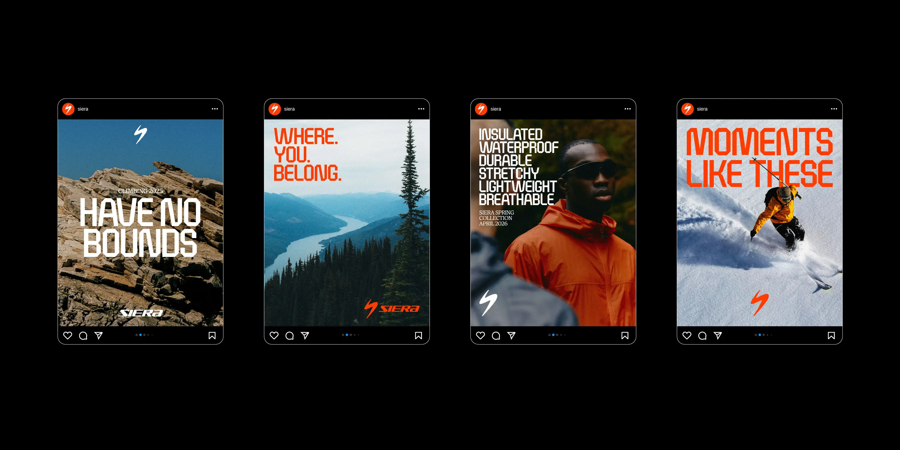 An electric orange as the main colour injects even more boldness and energy into the branding. Also designed to contrast with the greens, browns and blues of the outdoors, to stand out, not blend in, be bold and daring.